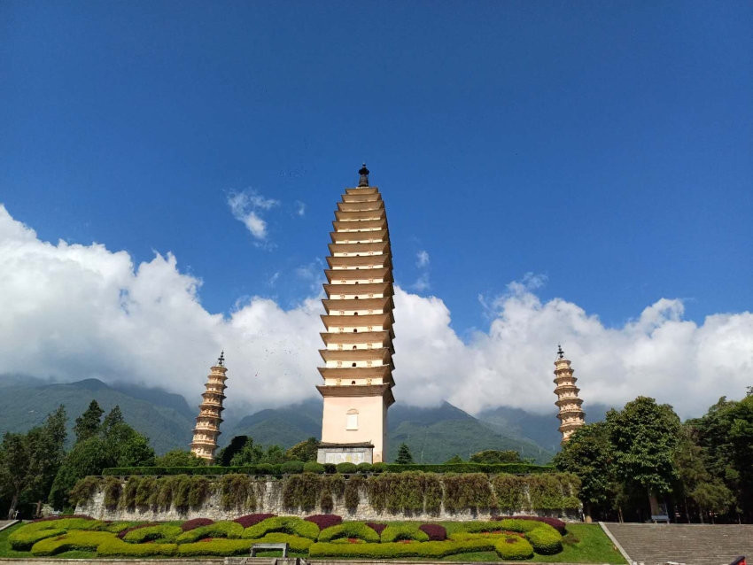 De Drie Pagodes van de Chongsheng Tempel, het iconische monument van Dali, met een geschiedenis van meer dan 1.800 jaar. De Drie Pagodes kijken uit op het prachtige Erhai-meer. Zoals de naam al doet vermoeden, staan er drie oude pagodes in een symmetrische driehoek en dat is uniek in de Chinese boeddhistische architectuur.