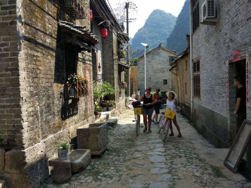 Fietstocht langs de romantische Yulong rivier in een landschap van imposante en dichtbegroeide karstbergen met hier en daar kleine, pittoreske dorpjes.