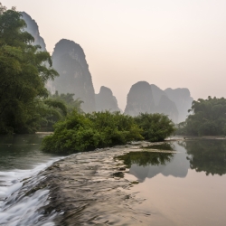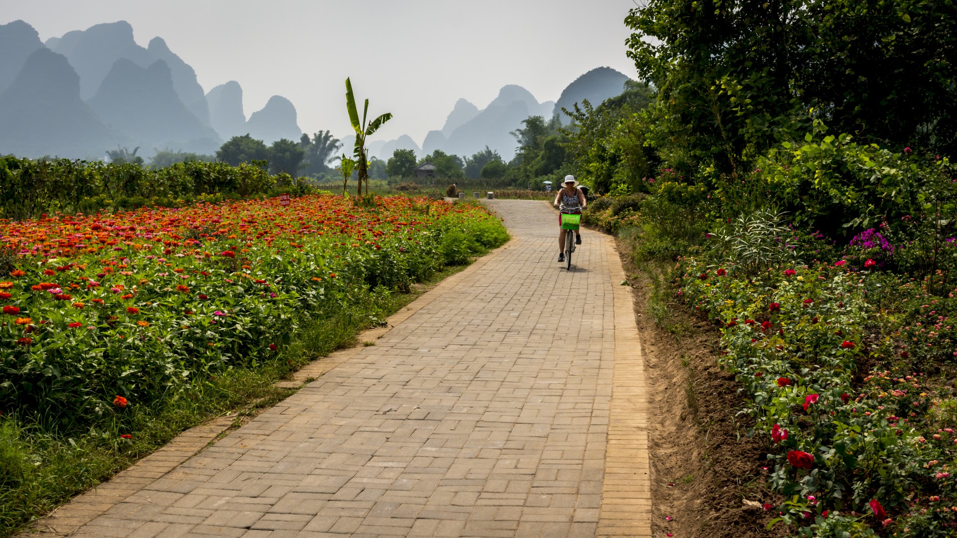 We vervolgden onze weg en daar was ze dan, de Yulong rivier. Wat was ze mooi, romantisch. Dat gemoedelijke watertje, met groene struiken op de oevers en hier en daar een bloemenperk. Ze was omringd door het karstgebergte met zijn afgeronde toppen, zijn ups en downs, weerkaatsend tegen de licht blauwe hemel en zich spiegelend in het heldere rivier water. We fietsten lekker over leuke houten bruggetjes. De kronkelende fietsweggetjes liepen dwars door de kleine rustige dorpjes waar de locals leefden op het ritme van de dag. We kruisten een Chinees koppeltje op een scooter, die was uitgerust met bovenkapje en wat tierlantijntjes, om de felle zon te mijden. Natuurlijk werd er af en toe een korte stop ingelast voor de oh zo nodige thuis foto’s.