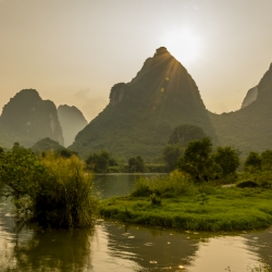 Het was zo’n lekker weertje, al fietsend kwamen we langs prachtige rijstvelden, geelgoud, plukklaar! Uitgestrekte gele velden aan de voet van het Karstgebergte, aan de oevers van de Yulong, waar hier en daar een boer zijn oogst aan het binnenhalen was.