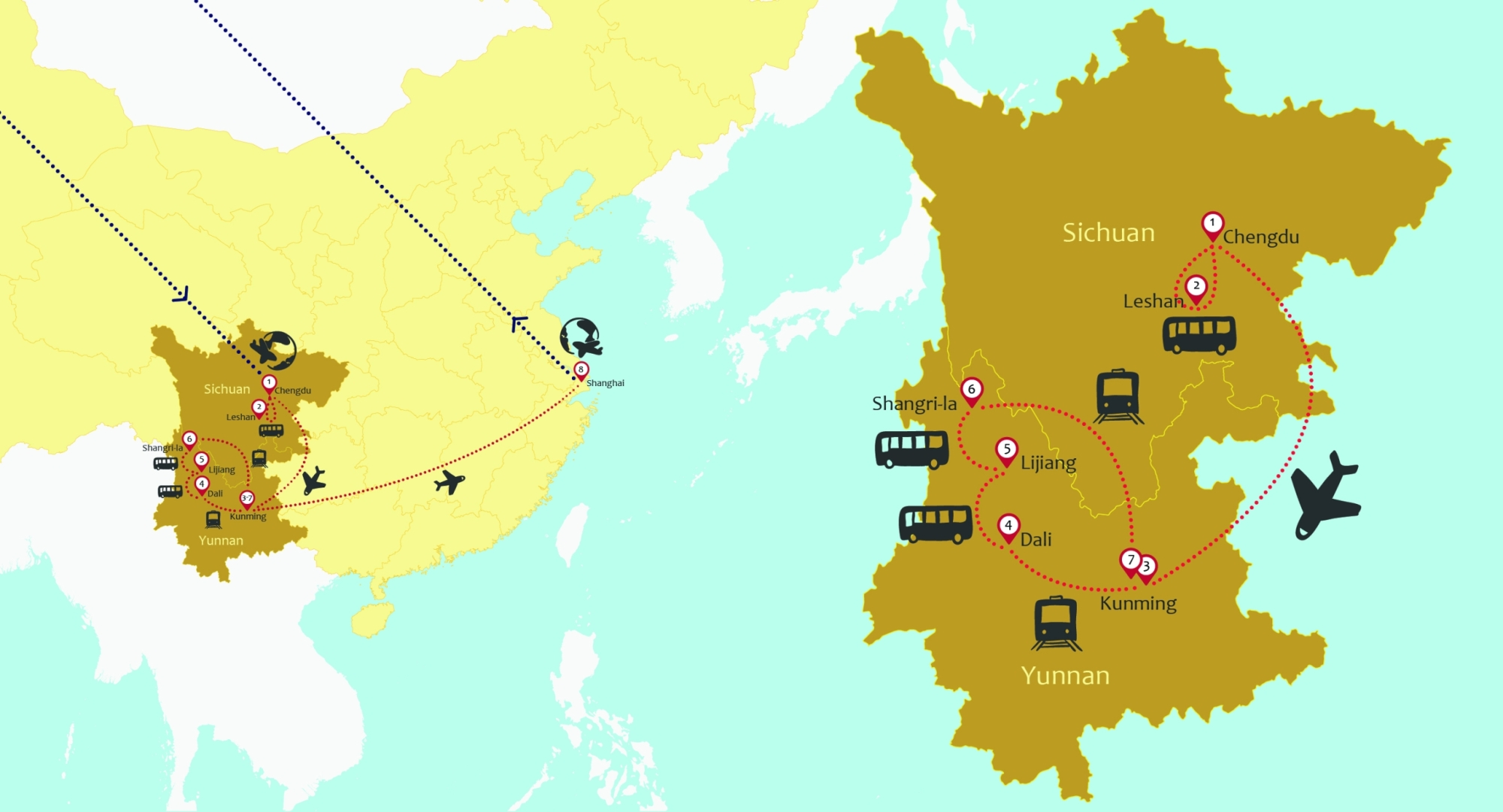 Samen vormen Shangri-la, Dali en Lijiang een reisroute van contacten: van Tibetaanse hoogvlaktes tot subtropische valleien, van mystiek boeddhisme tot eeuwenoude lokale gebruiken, van serene landschappen tot levendige markten en volksfeesten.